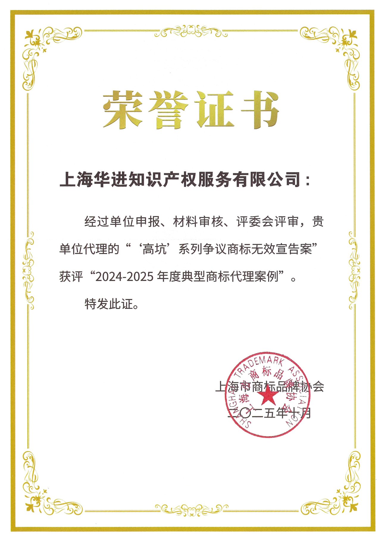 2025年10月16日,“榮光三十年·同心再啟航”上海市商標品牌協會成立30周年慶典在上海成功舉辦。會議期間,協會對在商標品牌領域作出突出貢獻的單位與個人進行了表彰,并公布了2024-2025年度典型商標代理案例評選結果。華進報送的“‘高坑’系列爭議商標無效宣告案”獲評“2024-2025年度典型商標代理案例”。